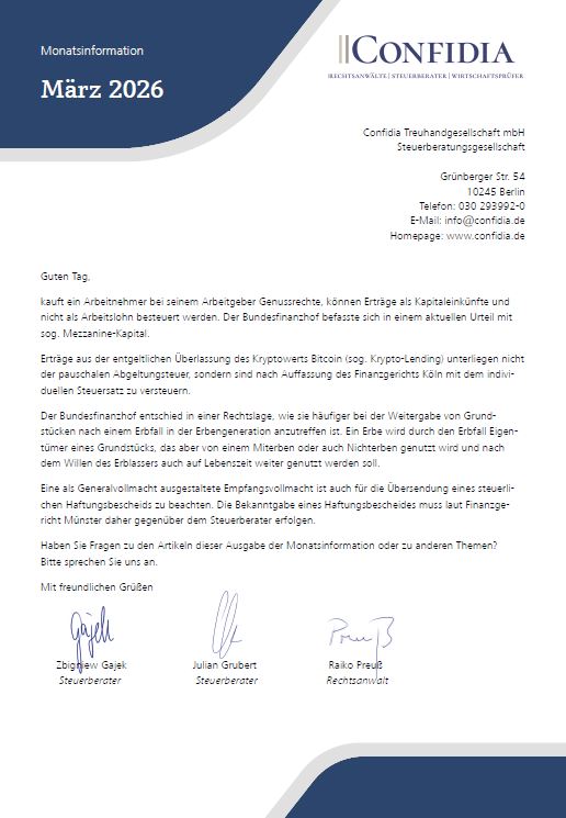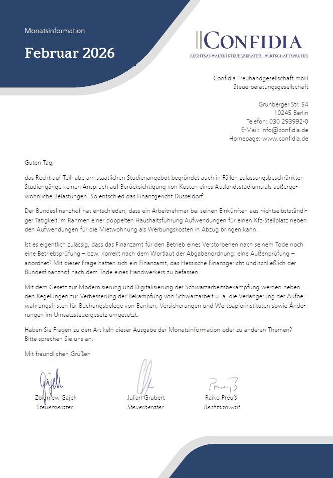 In diesem Bereich stellen wir Ihnen unsere monatlichen Mandantenrundschreiben zur Verfügung. Darin informieren wir Sie kompakt und verständlich über aktuelle steuerliche Änderungen, wichtige Fristen sowie relevante Neuerungen aus dem Steuer- und Wirtschaftsrecht. Die Rundschreiben stehen Ihnen jederzeit als PDF-Dateien zur Verfügung. Sie können diese bequem online durchblättern oder herunterladen, um sie abzurufen oder zu archivieren.